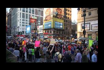 La circulación es un atasco viscoso. Le echo una carrera a un taxista indostánico que se detiene a mi vera, cuando el semáforo enrojece. Camino sin hacer trampa, a mi ritmo, a ver quién llega antes al siguiente cruce. Por los pelos, pero se inhibe un policía barrigudo provisto de todos los atalajes (pistola, esposas y otro montón de objetos colgando, a saber para qué) y habrá que atenerse a la foto finish. Aguardo su veredicto leyendo un anuncio sionista según el cual Israel aguanta tantos ataques de Hamás como editoriales del New York Times. El anuncio tapa una fachada destartalada, justo enfrente del prisma ciclópeo que aloja al Times.