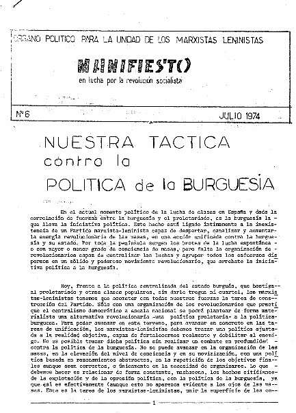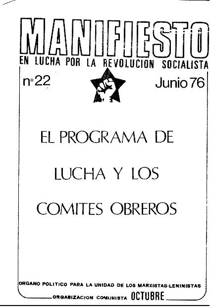 1974‘Manifiesto’ nº 6 con la táctica y ‘Plan de Agitación y Propaganda’.1975‘Nuestra Clase’ nº 25, publicación del ‘Proyecto de Programa de Lucha’, ‘una guía para la acción revolucionaria’.1976En mayo se produce la Unificación de los Comités Obreros (organizaciones de ‘masas avanzadas’ vinculadas a Octubre, los cuadros militantes del futuro partido). Se crea la Coordinadora de Comités Obreros.En junio, sale la revista ‘Manifiesto’ nº 22, con el ‘Programa de Lucha de los Comités Obreros’. Y en octubre se celebra la 1ª asamblea de Comités Obreros.
