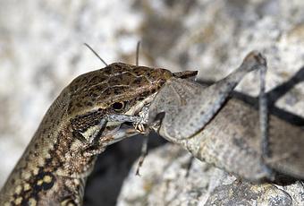 "A pesar de estar dotados de alas y potentes patas traseras para el salto, así como de un duro exoesqueleto, los saltamontes también tienen poderosos predadores, como esta lagartija (Podarcis muralis) que tal y como se muestra en la imagen ha capturado a este ejemplar del género Oedipoda."