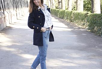 En esta ocasión quería ir cómoda y con pantalones anchos, no ajustados. Por eso opté por estos vaqueros de cuello alto que me parecen muy modernos a la vez que estilosos. Llevo mis zapatillas Stan Smith en blancas y azules a juego con la camisa de cuadros en los mismos tonos. Encima llevo una chaqueta azul marino que ya me habéis visto en alguna ocasión y que compré en el mercadillo de Camden Town de Londres, de ahí su estilo british.