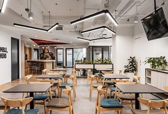 Un espacio estrella, que parece sacado directamente de la ciencia ficción, es la sala de reuniones. Azules profundos, techos fibróticos parpadeantes y pantallas gigantes te hacen sentir flotando entre las estrellas, todo mientras se fomenta una experiencia de reunión sin igual.