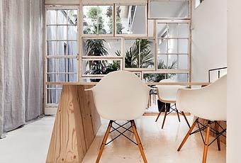 En la zona de trabajo sillas Eames de Vitra, tableros de madera a medida y daylights de Philippe Malouin.