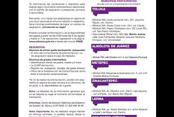 Clic en la imagen para descargar el pdf de la convocatoria.Toluca, Estado de México. Para garantizar una oferta educativa completa, inclusiva, de calidad y eficiente, en función de las necesidades y características de la población y como un complemento del Sistema Anticipado de Inscripción y Distribución (SAID), la Secretaría de Educación del Gobierno del Estado de México, pone en marcha el Programa de Apoyo a la Educación Básica (PAEB), disponible enwww.edomex.gob.mx.Dicho programa funcionará del 6 de agosto al 7 de septiembre del año en curso para escuelas ubicadas en Toluca, Zinacantepec, Almoloya de Juárez, Metepec, Lerma o San Mateo Atenco, de acuerdo a la disponibilidad de lugares.El PAEB permite a los padres de familia realizar la asignación de escuela en grados iniciales para los alumnos que no realizaron preinscripción en el mes de febrero; además, ofrece alternativas a los padres y madres de familia de elegir una escuela diferente a la que fue asignado(a) su hijo(a) por el SAID, siempre y cuando exista disponibilidad de lugares, así como cambio en grados intermedios en escuelas que también cuenten con lugares disponibles.Para atención a la ciudadanía están habilitados nueve módulos en las instalaciones de la Red de Innovación y Aprendizaje (RIA): Lerdo, Colón y Paseo Totoltepec, en Toluca; Almoloya de Juárez, Metepec, Zinacantepec, San Mateo Atenco y Lerma, así como uno más en la Secundaria Oficial No. 003 “Lic. Benito Juárez”, de Toluca.En el resto de la entidad, quienes tengan la necesidad de realizar un procedimiento similar, podrán acudir a las Subdirecciones Regionales de la Dirección General de Educación Básica, o a las Jefaturas de Sector cuando el plantel corresponda a los Servicios Educativos Integrados al Estado de México (SEIEM).Si los padres de familia tienen dudas con respecto al funcionamiento de este programa, podrán recibir orientación las 24 horas del día en el Centro de Atención Telefónica del Gobierno del Estado de México (CATGEM) 01800-696-9696; y recordar que éste es un trámite personal y gratuito.