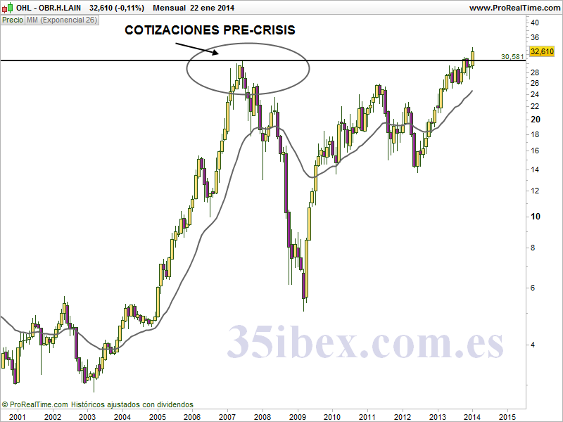 Está claro que en bolsa no se valoran realidades, se descuentan expectativas, y los inversores piensan que el negocio de OHL, será mucho mejor en el futuro de lo que es en la actualidad. Aunque hay que ser realista, en algún momento, el futuro nos cogerá o lo adelantaremos.Al superar la resistencia anterior, situada en 30.58, OHL se ha situado en subida libre y como ya he repetido en anteriores ocasiones, esto atrae a un tipo de inversor concreto, que gusta de estas situaciones en las que se supone que el precio no tendrá resistencias a seguir avanzando.