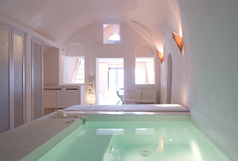 La piscina interna integrada al dormitorio , con piedras y velas ademas de sectores para bebidas frescas, son todos elementos de un confort rustico unico.