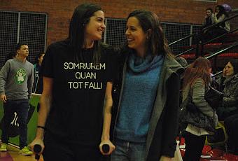 de gafas que está al lado de la columna y la de su derecha es mi madre”. Cruza la pista gracias a sus dos extremidades extra y me presenta a su hermana Laura. Cada asiento de la grada y cada silla del parqué guardan una hoja con un mensaje unánime: #ÀnimsMire 15.
