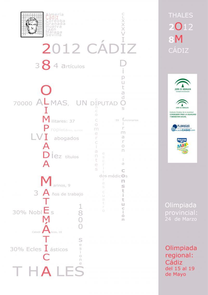 Estas olimpiadas constan de 2 fases. La primera es la provincial y se celebra en todas las provincias andaluzas el día 24 de marzo. La segunda fase es la regional, en la que los mejores de cada fase provincial pasarán una semana completa (del 15 al 19 de mayo) en Cádiz, celebrando la Pepa2012 y jugando con las matemáticas.