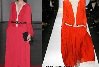 Olivia eligió para esta ocasión un vestido largo rojo y vaporoso, con un detalle muy tendencia actualmente, el bajo más largo por detrás, de BCBG Mx Azria. La trend-setter le añadió un cinturón marrón de cocodrilo y lo combinó con sandalias de pulsera bicolor, de Boutique 9 y bolso de mano negro. Las joyas eran de Carrera & Carrera, firma de joyería de la que es imagen.