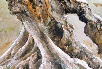 Como siempre, sigo pintando árboles. La mayor parte de ellos son ejemplares singulares que nunca dejo de visitar cuando se ponen a tiro en algún viaje. No es la primera vez que quedar a doscientos kilómetros se considera suficientemente a tiro. Cieza, Ricote, El Maestrazgo, la sierra del Segura o Cazorla, Villajoyosa, Daimiel... Algunos otros, los menos, recurro a alguna foto o reportaje en internet o en alguno de los libros que tengo sobre árboles catalogados, guías y otras fuentes. La rugosidad de sus cortezas, las formas retorcidas y caprichosas, los almendros o cerezos en flor, los olivos, pinos y encinas, siempre son excusa para trabajar las texturas, las sombras, los colores, las luces. Unas veces con acuarela o tintas, pluma estilográfica o rotuladores, últimamente con lápices, pasteles sobre papeles tintados, lo que permite fuertes contrastes al utilizar el blanco. En esta entrada va una mezcla de todo ello, dibujos y acuarelas, casi todos de este mes de julio que ahora termina, unos in situ, los menos, los más recurriendo al arsenal de fotos que tenemos almacenado para tiempos de sequía viajera.