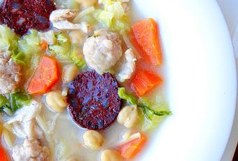300 gr garbanzos cocidos1 pechuga de gallina1 trozo de carne de ternera1 hueso de jamón1 huesos de cerdo1 palmo de butifarra negra¼ de col1-2 patatas2 zanahorias200-300 gr de fideo medio18 albondiguillasLaurel, salPoner en una ollaunos 3 litros de agua y añadir los garbanzos lavados dentro de una redecilla, , la pechuga, la ternera, el hueso de jamón y de cerdo (todo lavado), el laurel, sal y hervir por espacio de una hora y media.Sacar la red con los garbanzos, la carne y los huesos. Separar la carne y desmigarla o trocearla una vez esté fría. Reservar.Colar el caldo, añadir los garbanzos, las patatasy las zanahorias peladas y cortadas a dados de bocado. Cocer unos 15 minutos.Verter la pasta, la col cortada a tiras finitas, las albondiguillas y cocerhasta que la pasta esté al punto.Añadir entonces la carne desmigada y la butifarra negra cortada a rodajas. los ** Yo suelo emplear los cocidos y envasados por comodidad.** Los ** Hacer las ** La