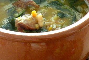 -200 grs. de alubias blancas. -200 grs. de lentejas. -200 grs. de arroz. -1 manojo de acelgas. -1 trozo de calabaza (250grs.) -Un par de pencas. -1 nabo. -1/2 Kgr. de patatas. (3 o 4 medianas). -1/2 Kgr. de costillas de cerdo. -1 cebolla. -Aceite de oliva virgen extra, pimentón dulce y sal. Hasta aquí si estamos a dieta, y si no lo estamos: -1 chorizo de guisar. -1 trozo de tocino entreverado.