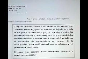 El mensaje a la radio enviado por un oyente, de que había olor a gas en la Escuela 315, tuvo su respuesta.Piedra del Aguila.- Al inicio de la semana pasada se había sentido olor a gas en una de las aulas de la Escuela Primaria 315, un mensaje recepacionado en la radiogregorioalvarez.net daba cuenta de eso. El 27 de junio la dirección del establecimiento envió una nota al medio que había leido el mensaje explicando los motivos, y en la mañana del lunes primero de julio la vice-directora Karina Sosa sale al aire por la radio (Audio para ampliar)