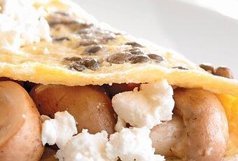 Ingredientes1/2 taza de lentejas cocidas4 huevos2 cucharadas de aceite de oliva1 cucharada de cebolla picada1 taza de champiñones partidos a la mitad1/2 taza de queso de cabra picadoSal y pimientaPreparación1. En un tazón combina las lentejas con los huevos, sazona con sal y pimienta.2. Fríe en el aceite caliente la cebolla; cuando esté suave, incorpora los champiñones y saltéalos unos minutos. Reserva.3. En la misma sartén forma los omelettes, rellénalos con los champiñones y agrega el queso.