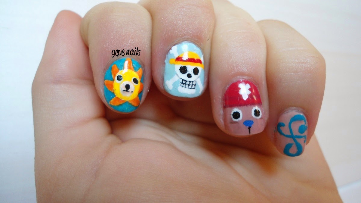 En el dedo índice está el adorno del barco "Thousand sunny". Es un sol/león jaja Es el que peor me salió de toda la manicura >.<