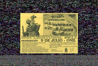 Fiesta y Feria de San Cristóbal 2011 en Onil (Alicante). La Fiesta de San Cristóbal, Patrón de los Conductores, se celebra el sábado, 9 de julio.El fin de semana siguiente tendrá lugar la III Feria de San Cristóbal 2011: