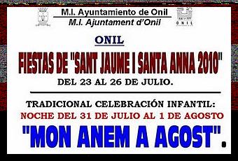 Por último el sábado, 31 de julio, tiene lugar la Tradicional Celebración Infantil "Mon Anem a Agost". La concentración es, a partir de las 21h, en la Plaza de la Malva desde donde se iniciará el recorrido de recogida de niños del pueblo para comenzar el tradicional "Viaje a Agost - Mon Anem a Agost". El recorrido estará amenizado por la "Colla de Dolçainers i Tabaleters Rudimentaria i Pandorga d'Onil".