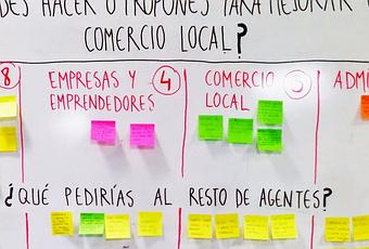 La segunda parte del taller tuvo como objetivo conocer la visión de cada grupo de agentes para mejorar el comercio local y que pediría cada uno al resto para conseguirlo. Tras la recogida de esta información se trabajó en grupos mixtos los retos más interesantes sobre los que trabajar para mejorar el comercio local.