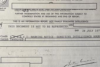 - El primer informe dirigido al Secretario de Estado Henry Kissinger, en el que se le alertaba sobre la existencia de la Operación Cóndor y sus implicaciones políticas para Estados Unidos. En un extenso informe del 3 de agosto de 1973, su adjunto Harry Shlaudeman, Kissinger fue informado de que las fuerzas de seguridad del Cono Sur habían establecido la Operación Cóndor para encontrar y eliminar terroristas en sus propios países y en Europa. Brasil está cooperando, aunque no se trata de operaciones de asesinato.