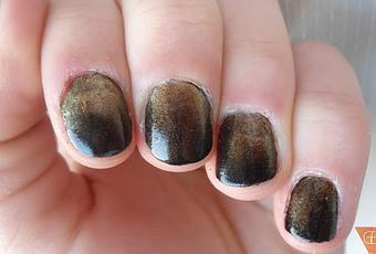 Pues resulta que ahí no acaba la cosa. Vale que el peel off no había salido, pero bueno, se podía quitar y quedarse un precioso degradado en varios colores, pero no... El tornasolado decidió que no quería cambiar de color según la luz y se ha quedado solo color cobre. ¡Qué chasco!