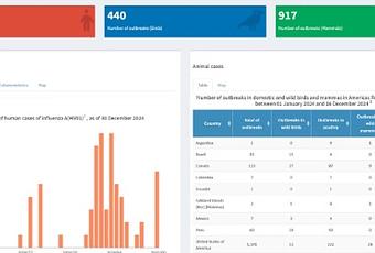 El tablero de indicadores incluye cuadros y mapas que muestran los brotes en humanos, así como en aves y mamíferos domésticos y silvestres en toda la región, estos últimos con datos provenientes de la Organización Mundial de Sanidad Animal (WOAH). A través de este recurso, la OPS fortalece sus esfuerzos de vigilancia activa para prevenir la posible transmisión de la enfermedad a los humanos.