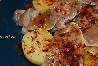 En la fuente de servir, ponemos en el fondo las patatas partidas por la mitad a lo largo, encima vamos colocando la carne partida en trozos. Espolvoreamos con el pimentón y rociamos con un chorro de aceite de oliva virgen extra por encima. Si las encontramos un poco sosas sazonamos al gusto.