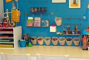 Instálales numerosos compartimentos para dejar todo lo que deseen, recogido tal como se muestra en la imagen superior. No necesitas gastar grandes cantidades. Basta con reciclar latas de conservas (por ejemplo de fruta en almíbar o de cacao soluble) pintadas o decoradas con papel y que pueden decorar ellos mismos.