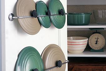 Hoy en SomosDeco os traemos una buen idea para mantener las tapaderas de las ollas y la sartenes en orden. Como veis en esta imagen sólo necesitamos poner una barra de toalla detrás de las puertas de nuestros armarios de cocina. Fácil y sencillo. via|Martha Stewart