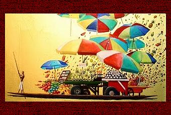 Obras llenas de exuberancia y desbordadas en sus proporciones. Todo parece exagerado, algo macondiano, si se quiere: de las embarcaciones brotan decenas de mariposas azules de todos los tamaños y ballenas del Pacífico. Las canoas transportan una iglesia colonial blanca con su paisaje de árboles de flores amarillas; ventas ambulantes de cocos y minutos de celular con sombrillas que salen volando; un paisaje de la Sierra Nevada, la selva, una maloca con su techo gigante y un cuadro abstracto de Carlos Salas. Sobre el bote llueven mangos y la letra del vallenato 'Alicia adorada'.