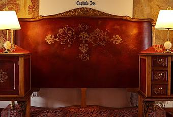 El respaldo estilo francés con balcón es para sommier de 1.40m. En su centro estampamos este arabesco en color oro con reminiscencias hindues. Lleva además un salpicado en oro sobre el fondo rubí.