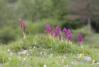 Aunque algo menos abundante que la anterior, la Dactylorhiza macuculata, o "Orquídea moteada de los pantanos", se puede encontrar fácilmente en praderas a cielo abierto. Tiene también hojas maculadas, pero las flores tienden al color blanco.Por último la Anacamptis palustris, o "Orquídea palustre" es una bella, grácil, rara y muy escasa orquídea, catalogada como vulnerable, que vive en praderas inundables.
