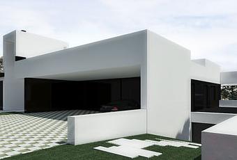 Exteriormente la vivienda se caracteriza por su sobriedad estructurada y diseñada en planos de líneas rectas. Se han utilizado colores característicos en el Estudio como son la mezcla del blanco y el negro, y materiales como el marmol travertino y el vidrio negro.