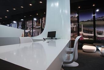 La zona de reuniones adquiere una mayor privacidad al quedar envuelta por una estructura curva realizada en madera lacada color blanco.