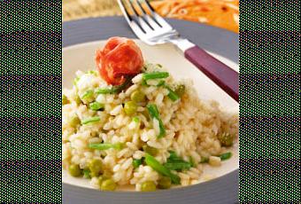 500 g de arroz 1 cebolla grande 200 g de judías verdes 100 g de guisantes en lata 3 lonchas de jamón serrano 100 g de queso parmesano 50 g de mantequilla aceite de oliva 2 dl de vino blanco seco 1 l de caldo de verduras sal y pimienta molida. Pelar y picar finamente la cebolla. Retirar las hebras de las judías verdes y cortarlas en juliana fina. Escurrir los guisantes del líquido de conserva. Llevar a ebullición el caldo de verduras y reservarlo al calor.