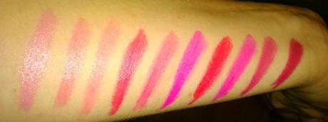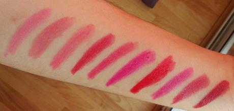 En la foto de abajo podéis ver como son y los tonos que hay, y ahora os dejo los swatches en mi brazo con luz natural y con flash, y cómo quedan una vez puestos en los labios. Espero que os gusten!