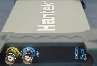El osciloscopio se conecta a un puerto USB del ordenador mediante un conector USB tipo B en la parte de atrás. Además el osciloscopio tiene un puerto USBXI, una tecnología de Hantek para conectar con otros aparatos. El cable para conectar al ordenador tiene dos conectores USB tipo A. El conector negro se utiliza para la transferencia de datos y la alimentación del osciloscopio. El conector rojo debe ser para alimentar el osciloscopio si por el otro conector no recibe suficiente energía, en mi caso no he necesitado conectarlo.