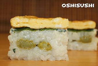 Preparación:1.- Pongo una capa de arroz en el oshibako. Lo prenso.2.-Coloco con cuidado los espárragos, otra capa de arroz y vuelvo a prensarlo bien.3. Ahora es el turno de la mahonesa. Le mezclo bien el wasabi y la unto sobre el arroz. Encima pongo las hojas de shizo verde y por último la tortilla.