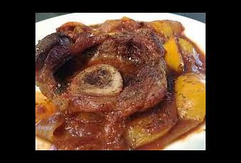 Cubrimos nuestras piezas de Ossobuco con la salsa , ponemos nuestros cuartos de peras y tapamos con papel de aluminio y al horno durante 2 horas