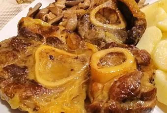 OSSOBUCO EN SALSA CON PATATAS CONFITADAS Y SETAS AL AJILLO