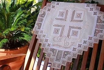Es un tapete cuadrado con mucho calado alrededor, ideal para una mesita redonda.