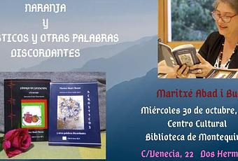 En la Biblioteca de Montequinto, el miércoles 30 de octubre de 2019, a las 19:00 horas, OTOÑO POÉTICO 2019 presenta a Maritxé Abad i Bueno y su obra literaria ‘Código de sanación a la naranja” y “Acrósticos y otras palabras discordantes”. CÓDIGO DE SANACIÓN A LA NARANJA nos acerca a otra manera de concebir los ...