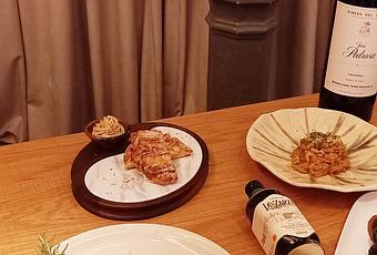 Morcilla de burgos a la parrilla con membrillo en dos texturas y uva africana / Arroz caldoso con habitas y gambitas / Carrilleras en salsa de hongos de temporada al vino tinto y romero/ Trenza con toque de nata agria con mascarpone