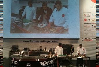 * Fotos: la primera del Iago Castrillón y su fiel escudero Patiño presentando la "Empanada de Pulpo seco y Pimiento a la Llama" en el Forum Gastronómico de Santiago y la segunda, una Vieira envuelta en Jamón Ibérico sobre cama de cebolla confitada y pan rallado con su coral de "O Fragón" en Fisterra.