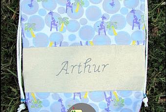 Esta mochila voló conmigo a UK, aprovechando el viaje que hice a Birmingham.Un primer plano de las letras, bordadas a mano, a punto de tallo, con hilo de la Finca del número 12.