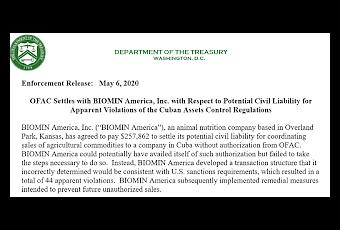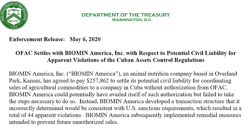 Ayer 6 de mayo de 2020, sobre la decision de la tristemente célebre Oficina para el Control de Activos Extranjeros (OFAC) del Departamento del Tesoro de EE.UU. del arreglo alcanzado para evitar un pleito judicial con la entidad BIOMIN America, debido a aparentes violaciones del Reglamento para el Control de Activos Cubanos (CACR). El monto a pagar por BIOMIN America, compañía de nutrición animal con sede en Overland Park, Kansas, es de 257 mil 862 USD.