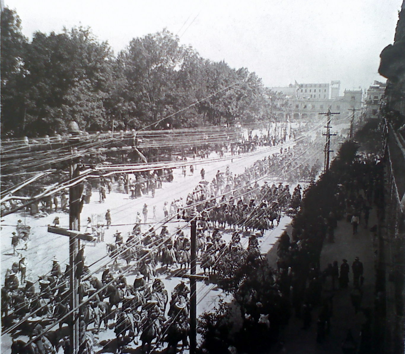 Vista del Zócalo desde un balcón: Desfile del 5 de mayo de 1913.