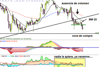 Mi previsión es que el precio llegue al soporte, como mínimo, aunque si tuviera que apostar diría que hay un 80% de posibilidades de que lo rompa. Ahí es donde habrá que estar pendiente, por que el volumen debe aumentar de manera importante y es probable que la mano fuerte entre comprando, en mínimos o cerca.