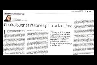 Acabo de leer con sumo gusto "Cuatro buenas razones para odiar Lima" de Maki Miró Quesada (El Comercio, Luces, 12-9-2015, C19), todo un ejemplo de redacción ágil, bella, desenvuelta. "Ruido, no se preocupe, nadie nunca me presenta a nadie, no existo". Justo lo que el Papa Francisco denuncia en "Laudato si" acerca de las caóticas megalópolis donde se malvive y nadie hace nada por convertirlas en moradas habitables. Y, después de agradecer a la autora, anoto como contrapunto "mis razones para amar Lima", una por día. Miércoles: Estuve en la Hermandad del Señor de los Milagros de Nazarenas exponiendo el tema "El Señor de los Milagros y la identidad del Perú". Disfruté de la vida familiar de las cuadrillas, de la amistad entre cuadrillas, de la auténtica Hermandad que, en septiembre, se prepara para el mes morado.