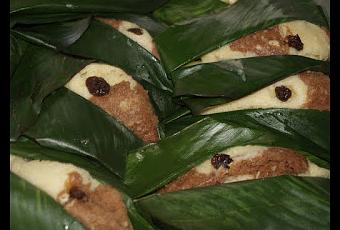 Masa de maíz con mantequilla, leche, jugo de naranja, huevos, azúcar y un toque de esencia de vainilla. Se le insertan uvas pasas a esa masa y enrollada en hoja de achira (una planta parecida a plataneras pero mas pequeñas) se cocinan al vapor durante unos treinta minutos. Los ingredientes, por lo que vi en diferentes puestos, varían según el gusto. El último que probé llevaba chocolate en la masa, delicioso.