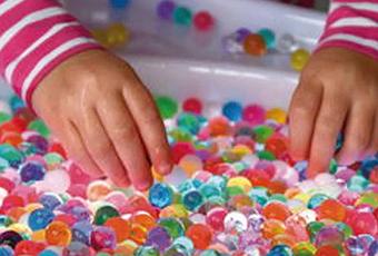 En casa tenemos un bote y de vez en cuando las usamos. Rellenamos un tupper o cubo pequeño con agua e introducimos las bolitas. Con el paso de los minutos vamos viendo cómo van aumentando su tamaño. Cuando están grandes (pueden considerarse así cuando tienen unos 5 milímetros de diámetro), podemos proceder a jugar con ellas. Los juegos consisten, básicamente, en hacer trasvases.
