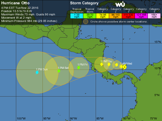 Lo más importante para destacar es que "Otto" podría seguir aumentando su fuerza antes de llegar a tierra, con un movimiento hacia el Oeste o Oeste - Noroeste en los próximos dos días. El fenómeno natural estará muy cerca de las costas de Nicaragua y Costa Rica el día jueves 24 de noviembre, según ha informado El Centro Nacional de Huracanes con sede en Miami.Por otra parte cabe mencionar que "Otto" no tocará tierra en Panamá, pero si le esta haciendo sentir sus efectos a dicho país con oleaje muy peligroso en zonas costeras y lluvias de variada intensidad en varias zonas del oeste y del centro de este territorio.